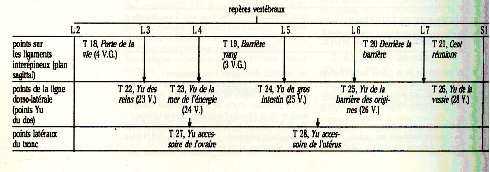 - un groupe antérieur en relation avec les gonades, les reins et peut-être les surrénales (point médian: Porte de la vie; points Yu dorsaux et de la Mer de l'énergie; points latéraux; Yu de l'ovaire et de l' utérus); ce groupe collecte les douleurs projetées en provenance des plexus rénal, surrénal et ovarien;
